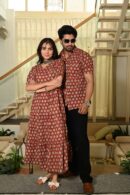 Couple Matching Red Cotton Anarkali Midi Dress and Shirt Set ? Gold Leaf Block Print